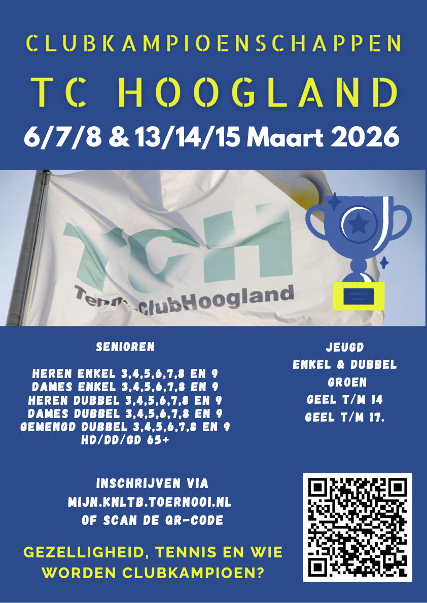 De weekends van 6, 7, 8 en 13, 14, 15 maart 2026 zijn bij Tennis Club Hoogland weer de jaarlijkse clubkampioenschappen. De perfecte voorbereiding op de competitie, maar natuurlijk vooral veel gezelligheid en uitdaging om de strijd aan te gaan met andere leden van onze club.