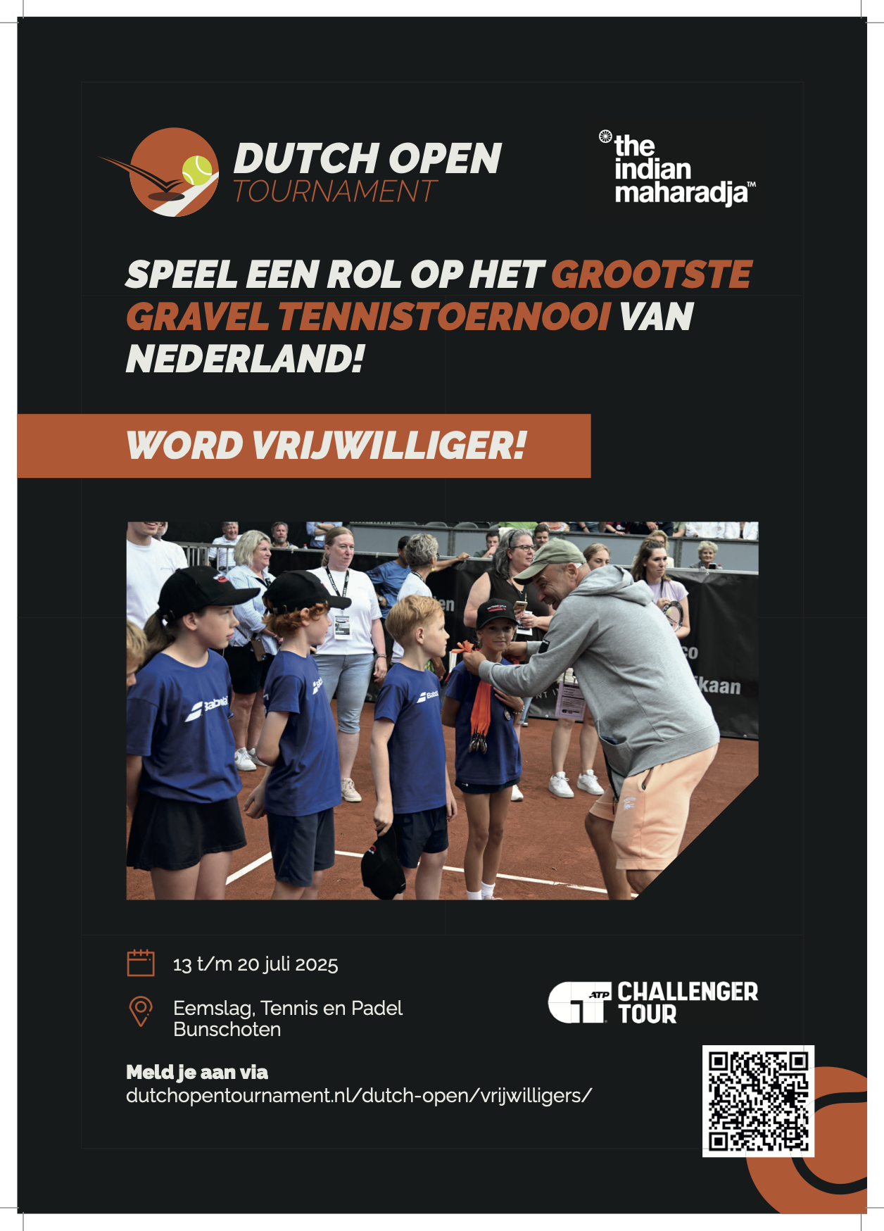 Voor het Dutch Open Tournament, dat in Bunschoten wordt georganiseerd van 13 t/m 20 juli 2025, worden volwassen vrijwilligers en ballenkinderen gezocht. Er komen toptennissers uit binnen- en buitenland op dit grootste proftoernooi op gravel in Nederland.