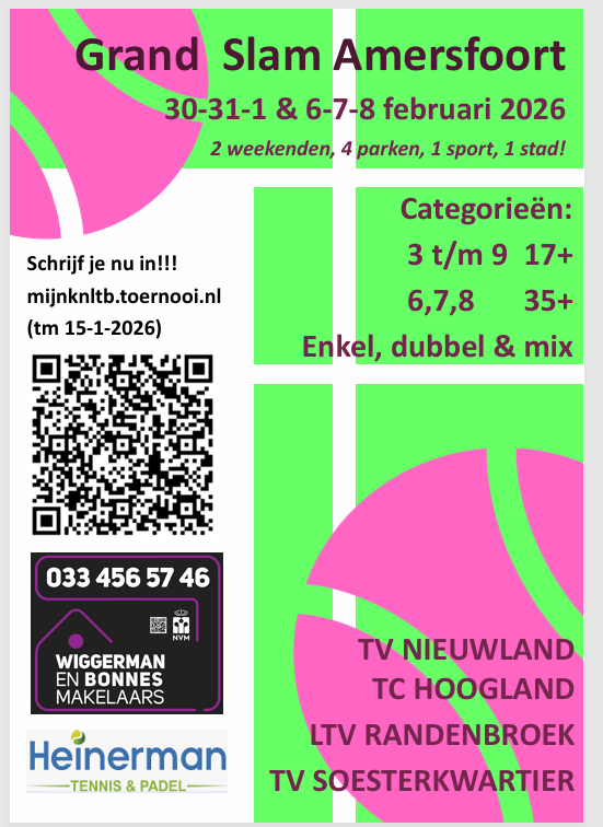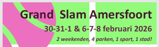 In 2026 hopen we al weer de 4e editie van Grand Slam Amersfoort te houden. Wat het idee was voor een gezellig onderling toernooi met andere verenigingen, is inmiddels uitgegroeid tot een groot, landelijk toernooi met bijna 600 deelnemers. Vorig jaar kwamen er zelfs deelnemers uit Sneek, Zeeland, Amstelveen, Arnhem. Veel waren blij om na alle feestdagen weer wat actiever te worden. Anderen hadden dit nodig om punten te halen om zo te kunnen starten met de opleiding voor tennisleraar. De ander vindt het spelletje leuk maar de 3e helft leuker.